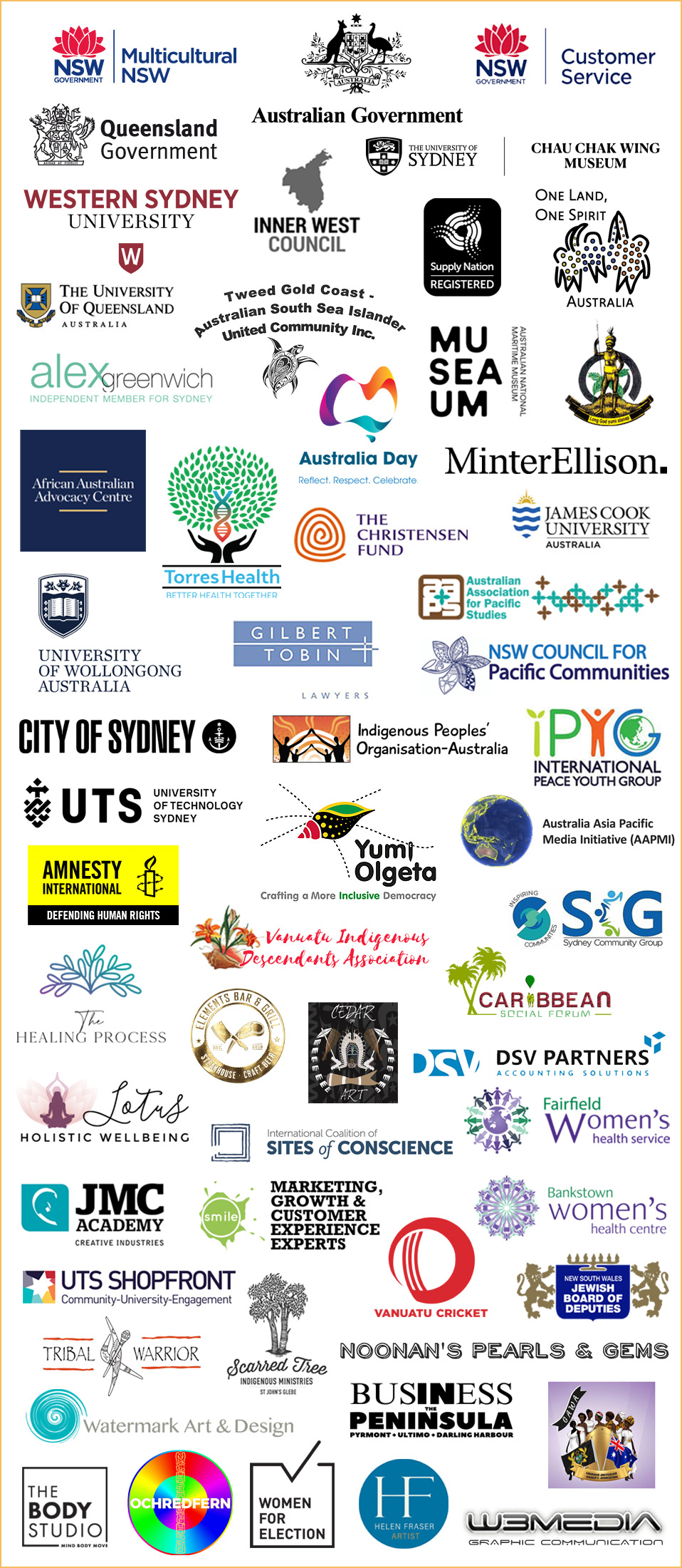 African Australia Advocacy Council; Alex Greenwich – Independent Member for Sydney; Amnesty International; Australian Asia Pacific Media Initiative; Australian Government; Australian National Maritime Museum; Bankstown Women’s Health; Business in the Peninsula + Pyrmont + Ultimo + Darling Harbour; CAGES Foundation; Caribbean Social Forum – UK; Chau Chak Wing Museum – The University of Sydney; City of Sydney Council; David & Jennie Sutherland Foundation; Department of Foreign Affairs & Trade; DSV Accounting Solutions; Elements Bar and Grill; Fairfield Women’s Health Service; Ghanian Women’s Association; Gilbert + Tobin; Helen Fraser; Indigenous Peoples Organisation Australia; Inner West Council; International Coalition Sites of Conscience; International Council on Monuments and Sites; International Peace Youth Group; James Cook University; JMC Academy; Khal Torabully – Coolitude; Lotus Holistic Wellbeing; Minter Ellison; Multicultural NSW; National Australia Day Council; Noonan’s Pearls & Gems; NSW Council for Pacific Communities; NSW Government Legislative Assembly; NSW Jewish Board of Deputies; OCHREDFERN; One Land One Spirit Australia; Queensland Government; Scarred Tree Indigenous Ministries; Smile Marketing; St Johns Anglican Church Glebe; Supply Nation; Sydney Community Group; The Body Studio; The Christiansen Fund; The Healing Process; Toby Cedar Art; Torres Health Indigenous Corporation; Tribal Warrior; Tweed Gold Coast ASSI United Community Inc; University of Queensland; University of Technology (UTS) Centre for Social Justice; University of Wollongong; Vanuatu Government; Vanuatu High Commission to Australia; Vanuatu Indigenous Descendants Association; Vanuatu Cricket; Vanuatu Women’s Handicraft Markets; w3media; Watermark Art & Design; Western Sydney University; Women for Election Australia; Yumi Olgeta – Crafting a More Inclusive Democracy; and all our other multicultural community groups and supporters, both local and international.